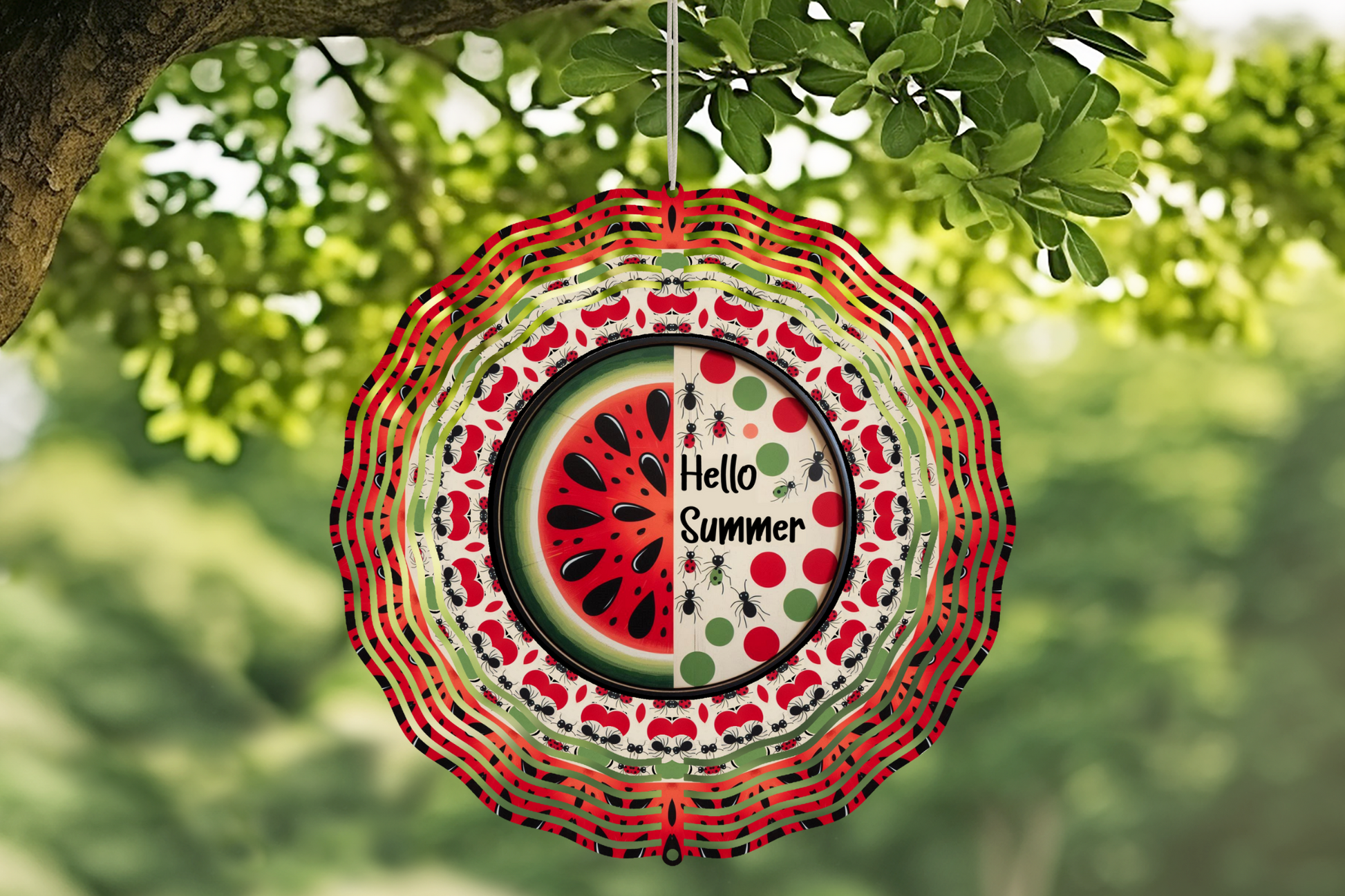 10 inch metal wind spinner, printed both sides. Hangs from anywhere!